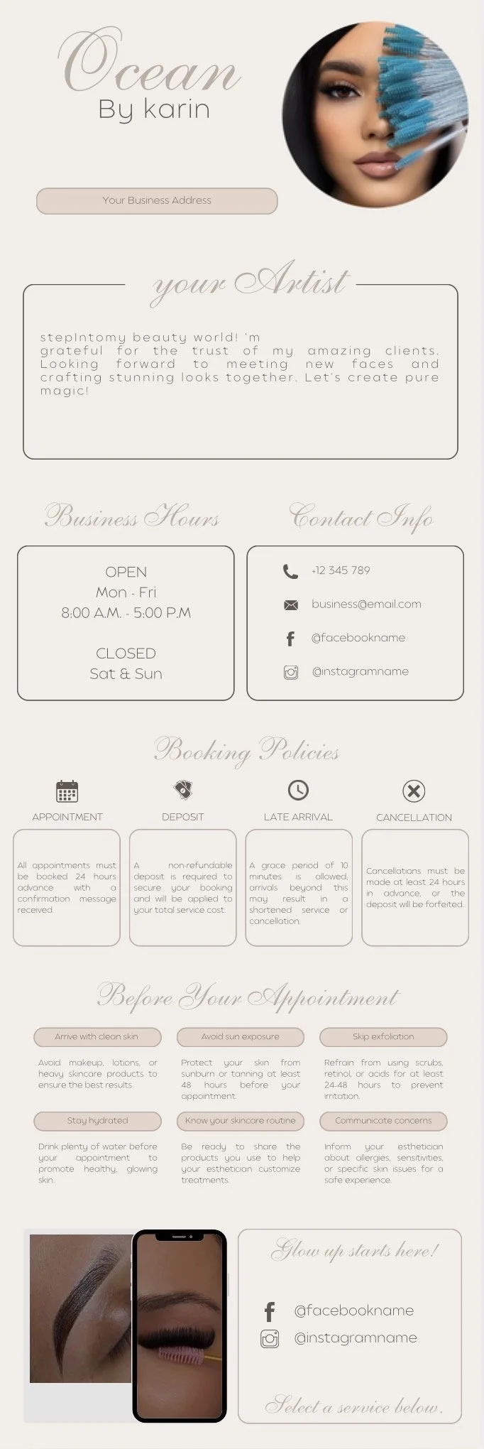 Compra tus plantillas Plantillas Formularios para clientes de extensiones de pestañas US$7.00 Añadir al carrito ¡Añadido! Plantilla aesthetic gold US$14.00 Añadir al carrito ¡Añadido! Plantilla beige glowup! US$14.00 Añadir al carrito ¡Añadido! Plantilla moderna y sofisticada US$14.00 Añadir al carrito ¡Añadido! ¿Tienes preguntas?Oceanbeauty19@hotmail.com(973) 391-6151Nueva Jersey, Newark 07104